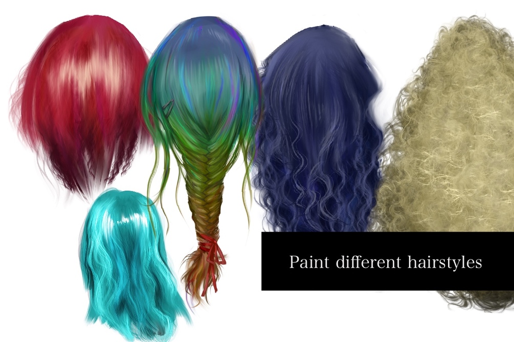 For best results, first draw the general shape of the hair in a darker color, then add details with the provided brushes. Use the shading brush to smudge highlight and shadow areas.