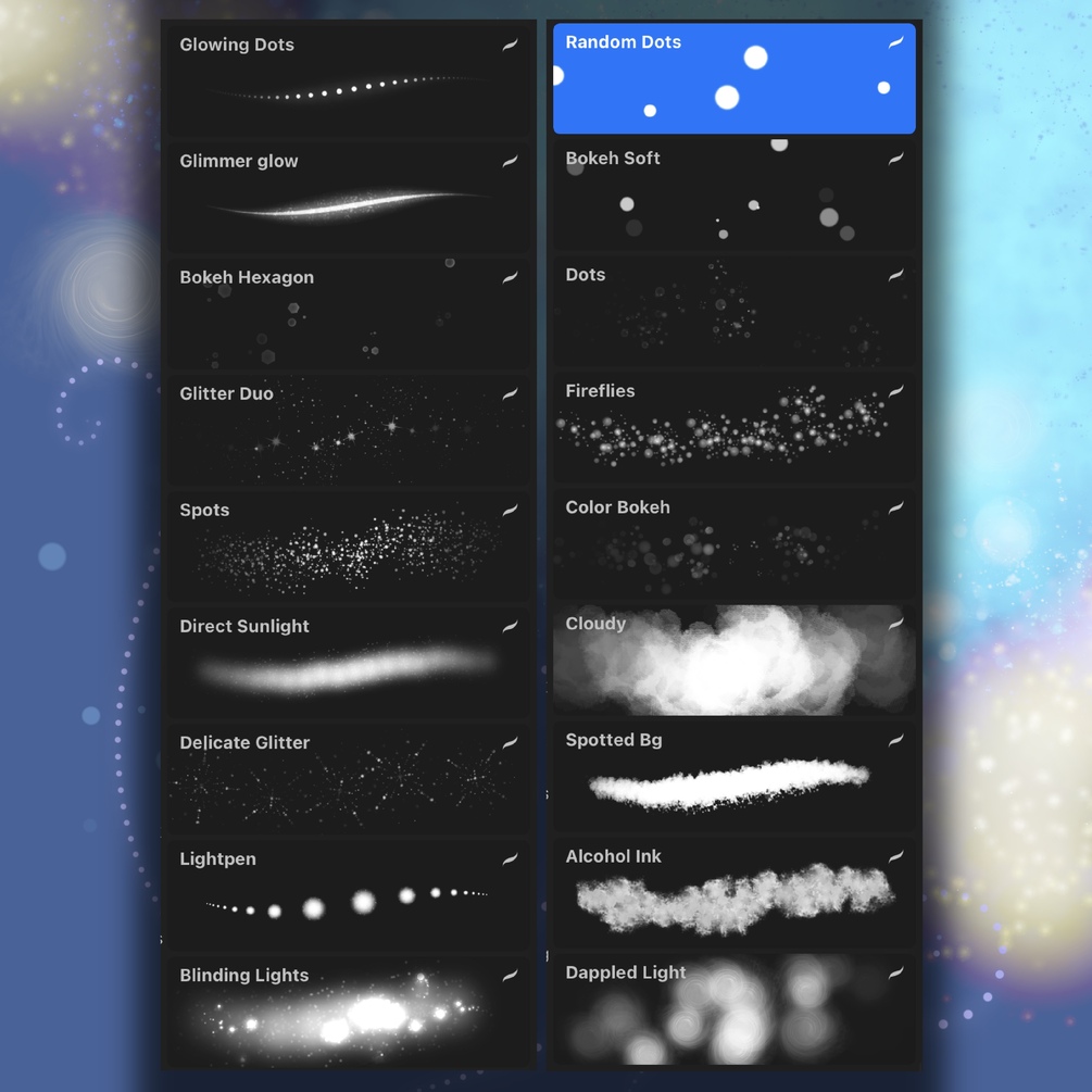 This brushset for Procreate contains 18 brushes to add some sparkle and light effects to your digital artwork. Add Bokeh effects or light to your paintings or photos exactly where you want it to be.